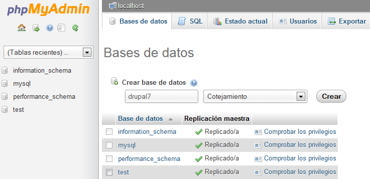 Seguidamente, crearemos la base de datos MySQL, bien con la consola de MySQL o con phpMyAdmin. En nuestro caso crearemos la base de datos, a la que llamaremos drupal7, desde http://localhost/phpmyadmin/ tal y como se muestra en la siguiente imagen: