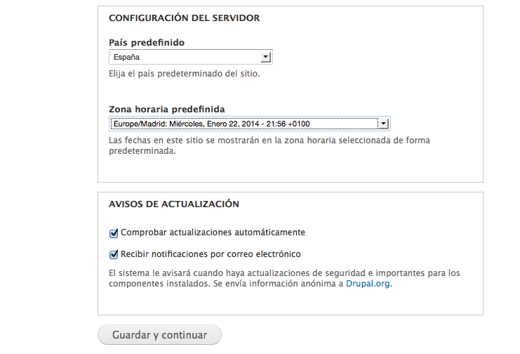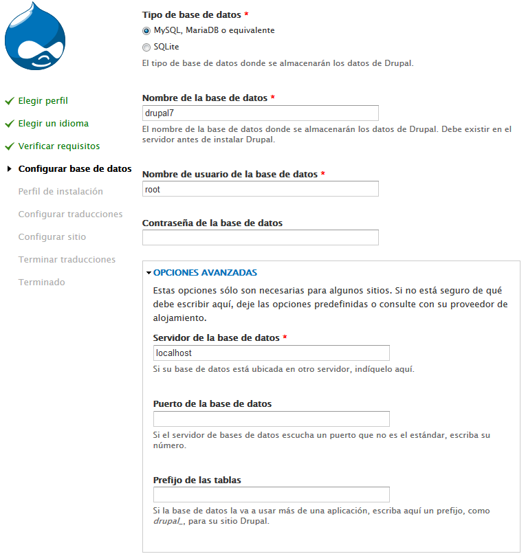 Seguidamente, procederemos a configurar drupal. Entramos a http://localhost/drupal7. Cumplimentamos la ventanas que nos van apareciendo del siguiente modo: