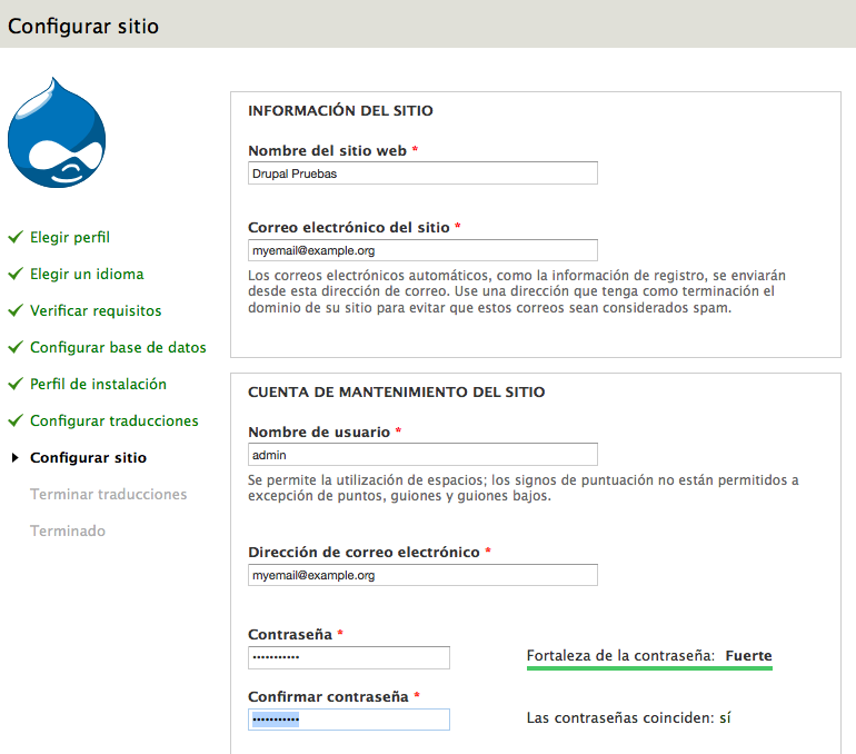 Es muy importante recordar la contraseña, porque si no, no podremos entrar más tarde a la página web de Drupal. Por defecto, Drupal tiene un sistema que bloquea el sistema de identificación si se producen más de cinco intentos incorrectos. Para poder realizar el desbloqueo, será necesario borrar los registros de la tabla flood relacionados con la dirección ip desde la que se han hecho la identificaciones incorrectas,