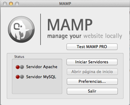 La forma más fácil de instalar Drupal 7 en Mac, sin interferir con lo ya instalado en el ordenador, es instalando MAMP, que podemos bajar de la página http://www.mamp.info/en/index.html.Deberemos descomprimir el archivo .zip e instalar el archivo pkg. Tras realizar la instalación, tendremos una página de control similar a la que se muestra en la siguiente imagen: